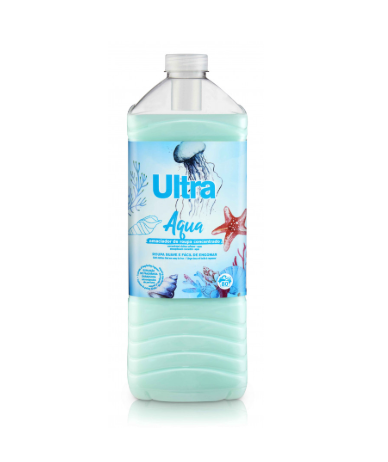 Garrafa de amaciador de roupa Ultra Aqua azul claro com etiqueta marinha.