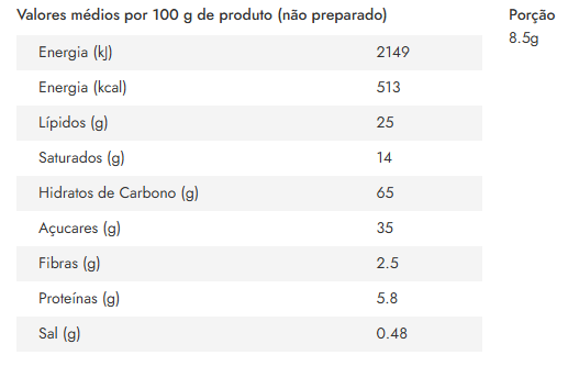 Farinha de TRIGO, chocolate de LEITE (39%) [açúcar, manteiga de cacau, pasta de cacau, LEITE em pó, soro de LEITE em pó, emulsionante (lecitina de SOJA), aroma], açúcar, gordura vegetal (palma), levedantes (hidrogenocarbonato de sódio e hidrogenocarbonato de amónio), sal, aroma.