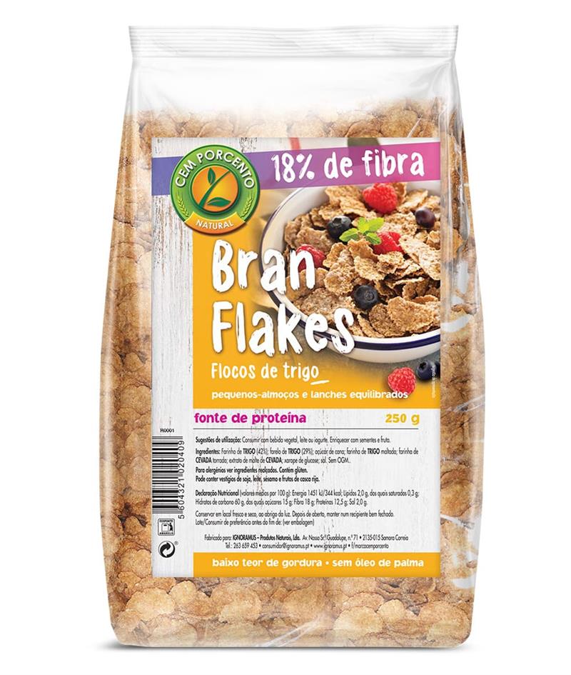 Pacote de flocos de trigo Bran Flakes com 18% de fibra e 250 g
