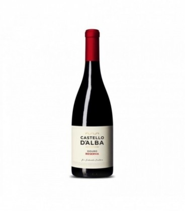 Garrafa de vinho tinto Castello D'Alba Douro Reserva com rótulo branco e rolha vermelha