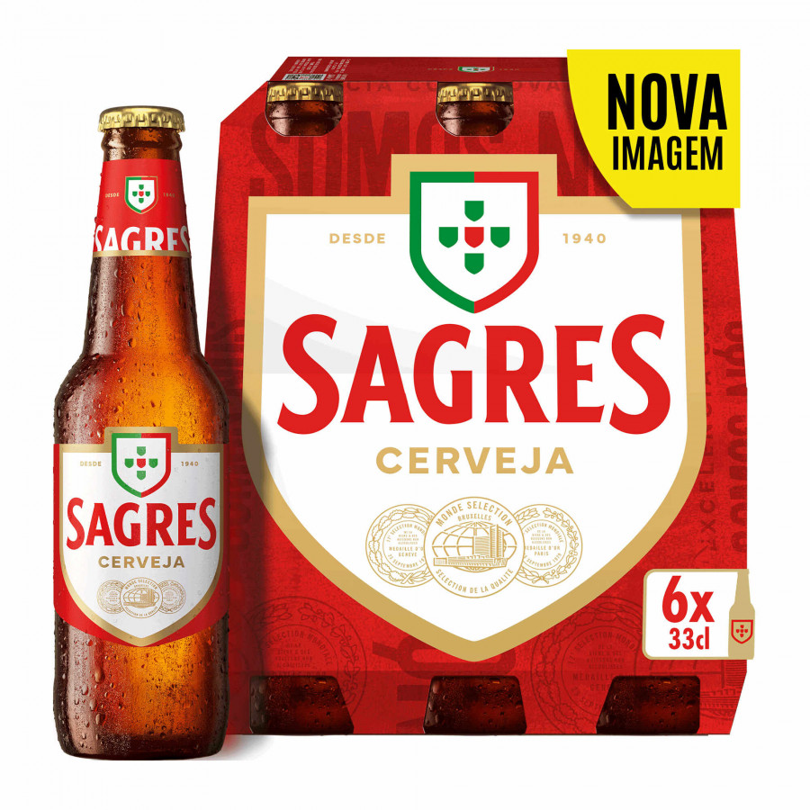 Embalagem de cerveja Sagres com seis garrafas de 33cl, embalagem vermelha e branca, garrafa castanha com rótulo Sagres