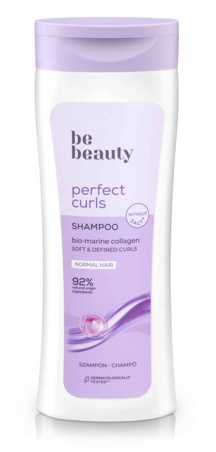 Frasco lilás e branco de champô be beauty perfect curls para cabelo normal.