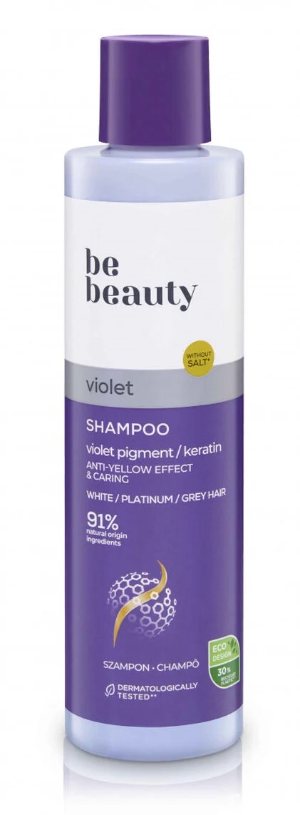 Frasco de champô be beauty violet com rótulo roxo e branco e tampa roxa