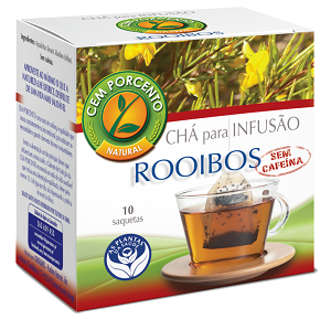 Embalagem de chá Rooibos com 10 saquetas, rótulo natural e sem cafeína