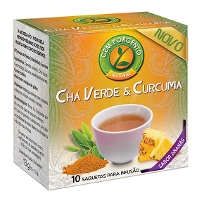 Caixa de chá verde e curcuma sabor ananás da marca Cem Porcelo Natural