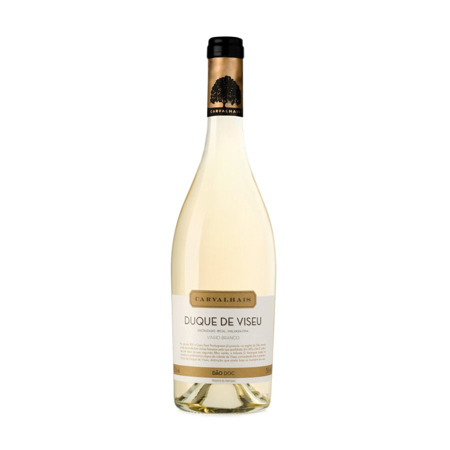 Garrafa de vinho branco Carvalhais Duque de Viseu com rótulo branco e dourado