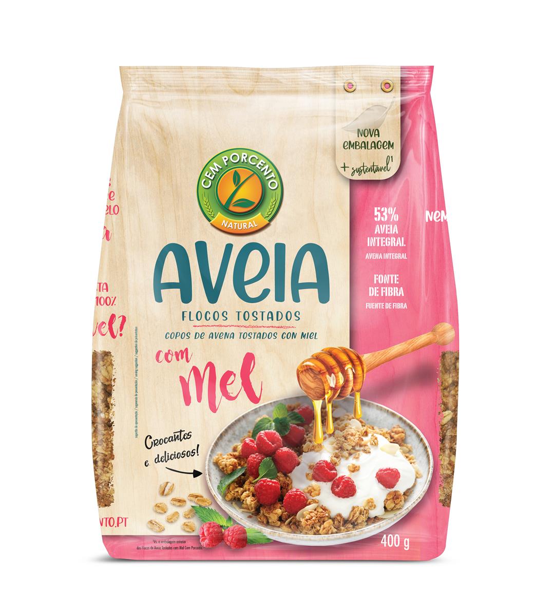 Pacote de aveia em flocos tostados com mel, com imagem de aveia com frutas vermelhas e mel