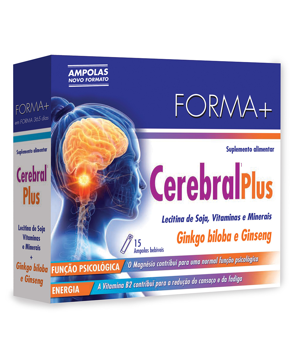 Embalagem azul e branca de suplemento alimentar FORMA+ Cerebral Plus com imagem do cérebro humano.