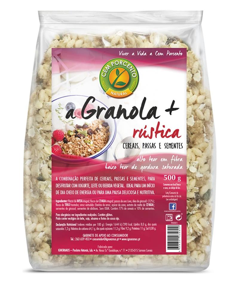 Pacote de granola natural Cem Porcento rústica 500g com cereais, passas e sementes