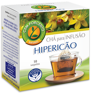 Caixa branca e verde de chá para infusão Hipérico com imagem de chávena e saqueta de chá