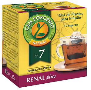 Pacote amarelo de chá CEM PORCENTO NATURAL RENAL plus com imagem de chá num copo