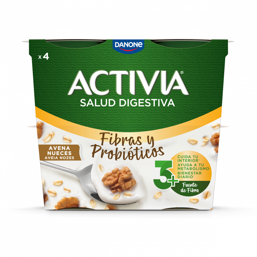 Ingredientes: Leite desnatado, água, nata pasteurizada, leite em pó desnatado, frutose, açúcar, xarope de oligofrutose, aveia integral (1,5%), nozes (1%), bifidobactérias e fermentos láticos, aromas e corante (caramelo simples).