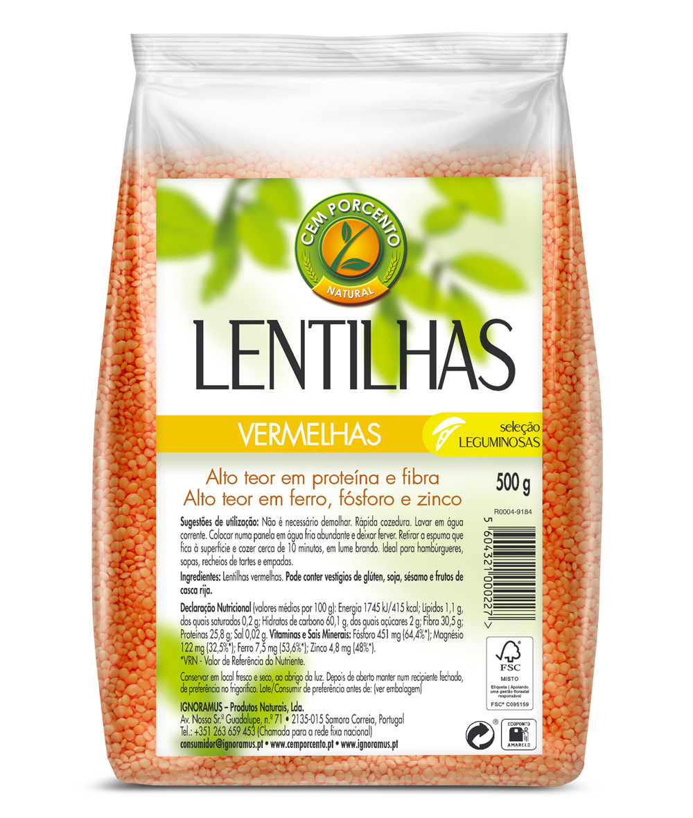 Pacote de lentilhas vermelhas Cem Porcento Natural, 500g, com texto informativo em português