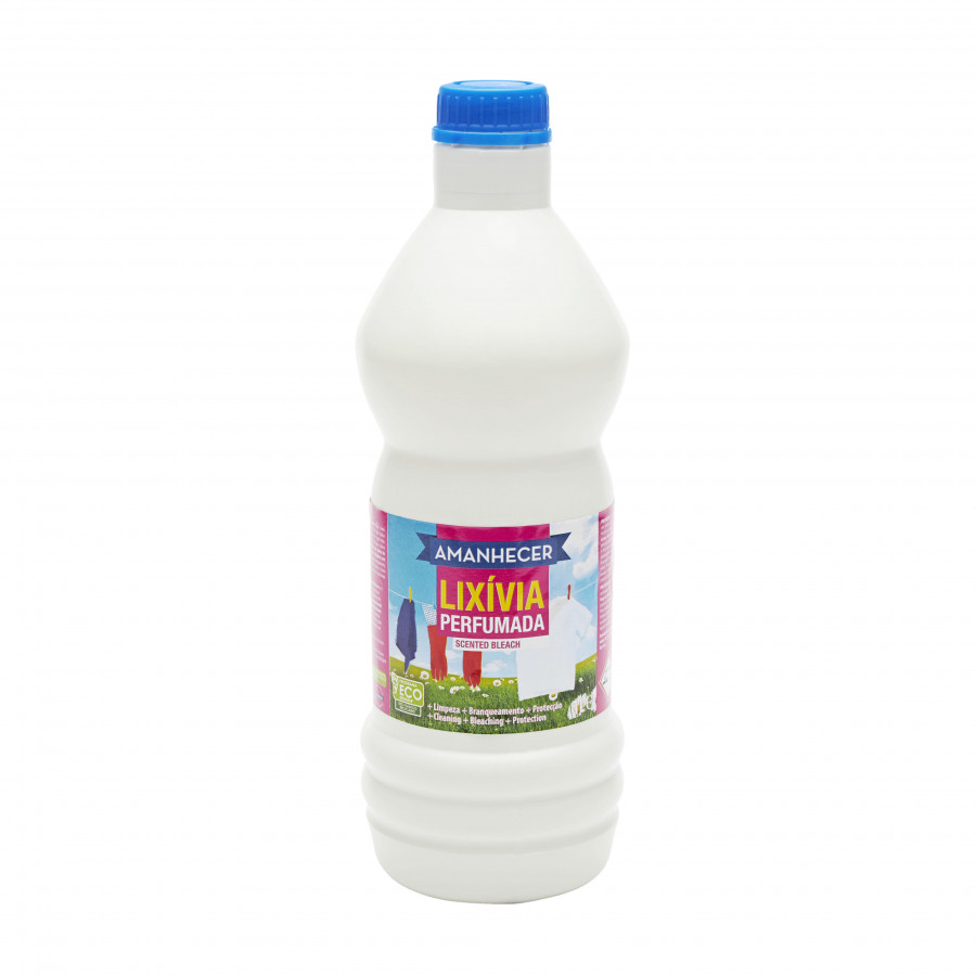 Garrafa branca de lixívia perfumada com tampa azul e etiqueta colorida.