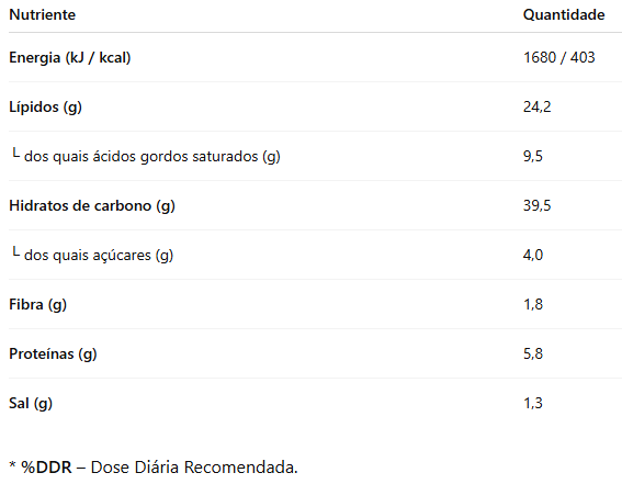 Ingredientes: Farinha De Trigo, Matérias Gordas E Óleos Vegetais (Palma, Girassol, Em Proporções Variáveis), Água, Álcool Etílico, Açúcar, Sal, Sumo De Limão Concentrado, Agente De Tratamento Da Farinha (L-Cisteína).