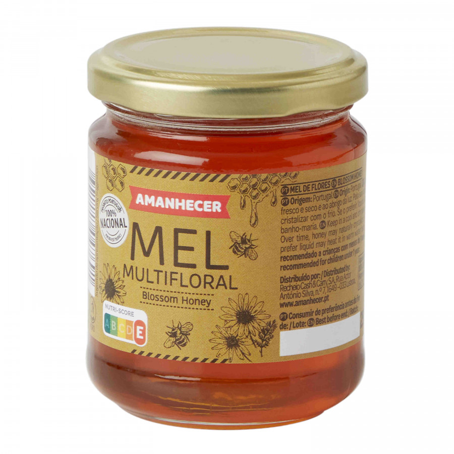 Frasco de mel multifloral Amanhecer com rótulo castanho claro e tampa dourada