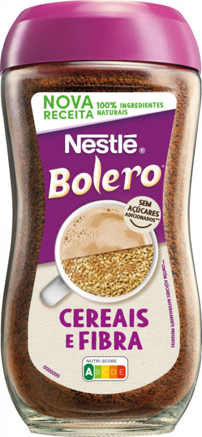 Frasco de Nestlé Bolero cereais e fibra com tampa rosa e rótulo roxo