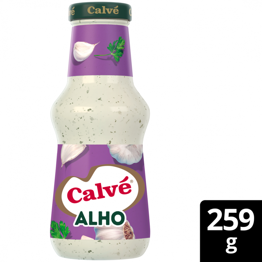 Molho de alho Calvé em frasco de vidro com tampa verde e rótulo lilás