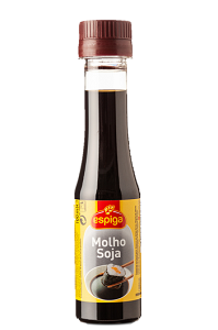 Garrafa de molho de soja Espiga com rótulo amarelo e cinza