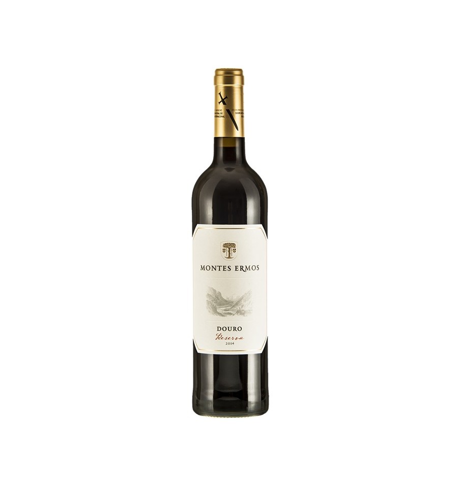 Garrafa de vinho tinto Montes Ermos Douro Reserva 2014 com rótulo branco