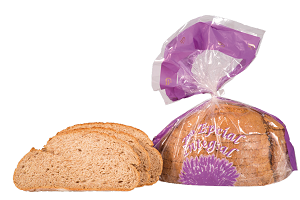 Pão integral embalado em plástico roxo com fatias de pão ao lado