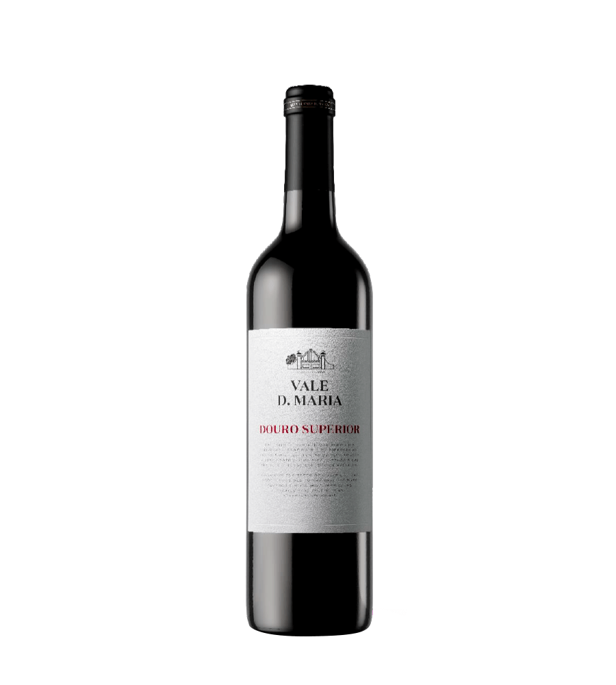 Garrafa de vinho tinto VALE D. MARIA DOURO SUPERIOR com rótulo branco e tampa preta