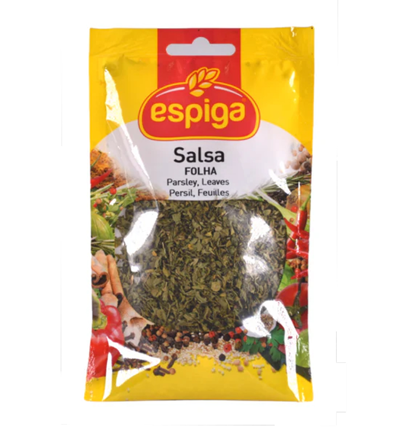 Pacote plástico amarelo e vermelho de salsa seca da marca espiga