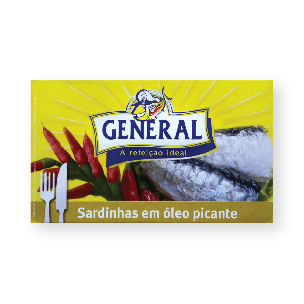 Lata de sardinhas em óleo picante marca GENERAL com imagem de sardinhas e malaguetas