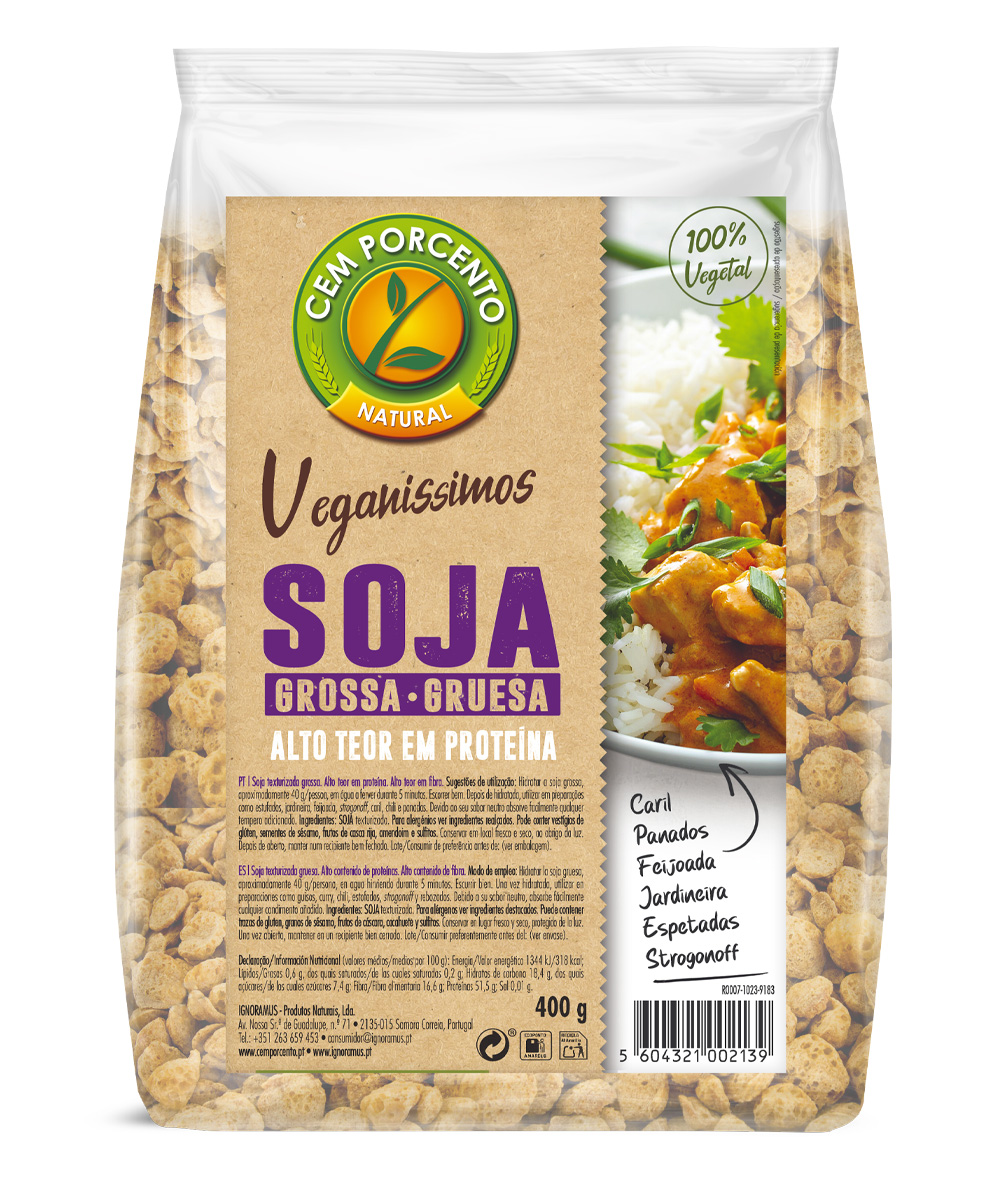 Pacote de soja texturizada grossa VEGANÍSSIMOS com selo cem por cento natural