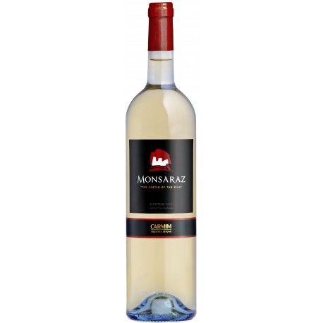 Garrafa de vinho branco Monsaraz com rótulo preto e vermelho