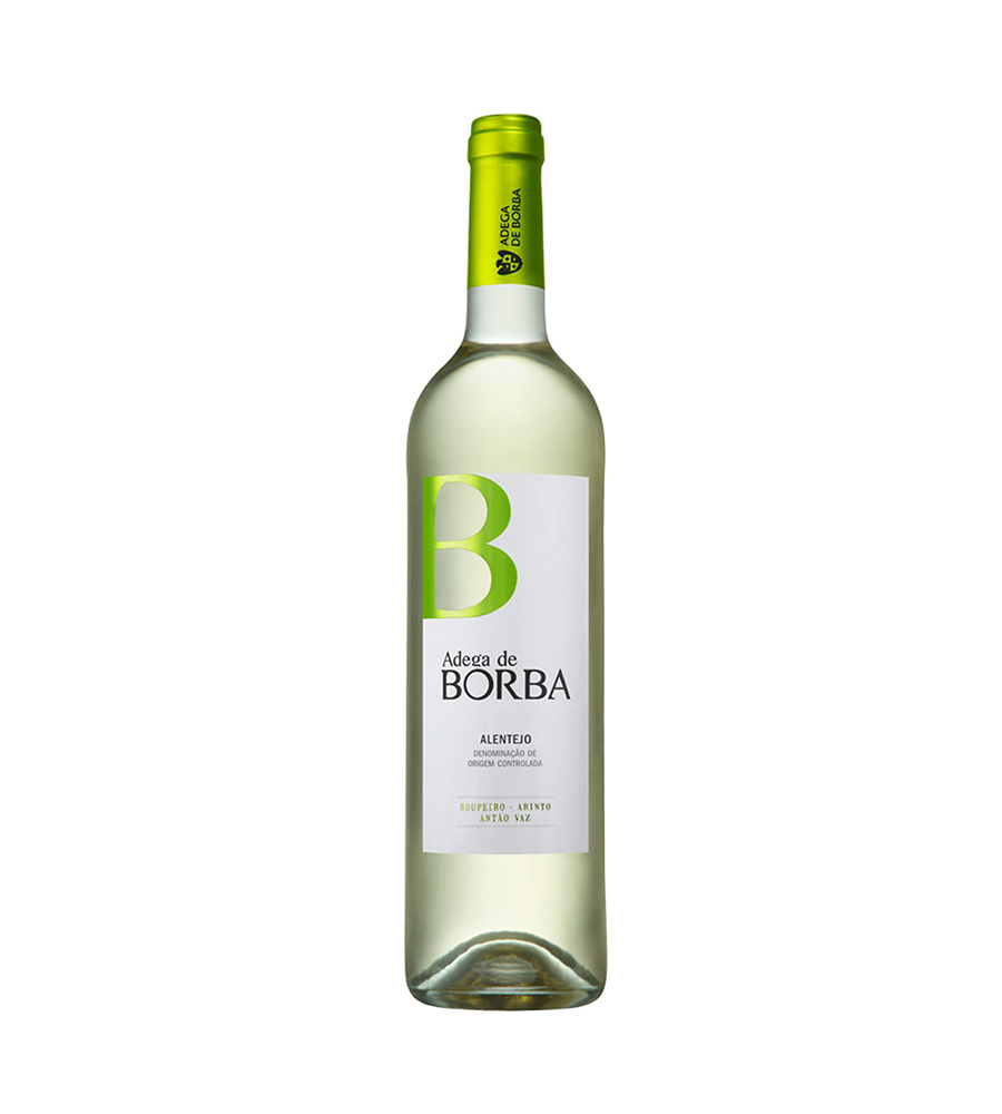Garrafa de vinho branco Adega de BORBA do Alentejo com rótulo branco e verde