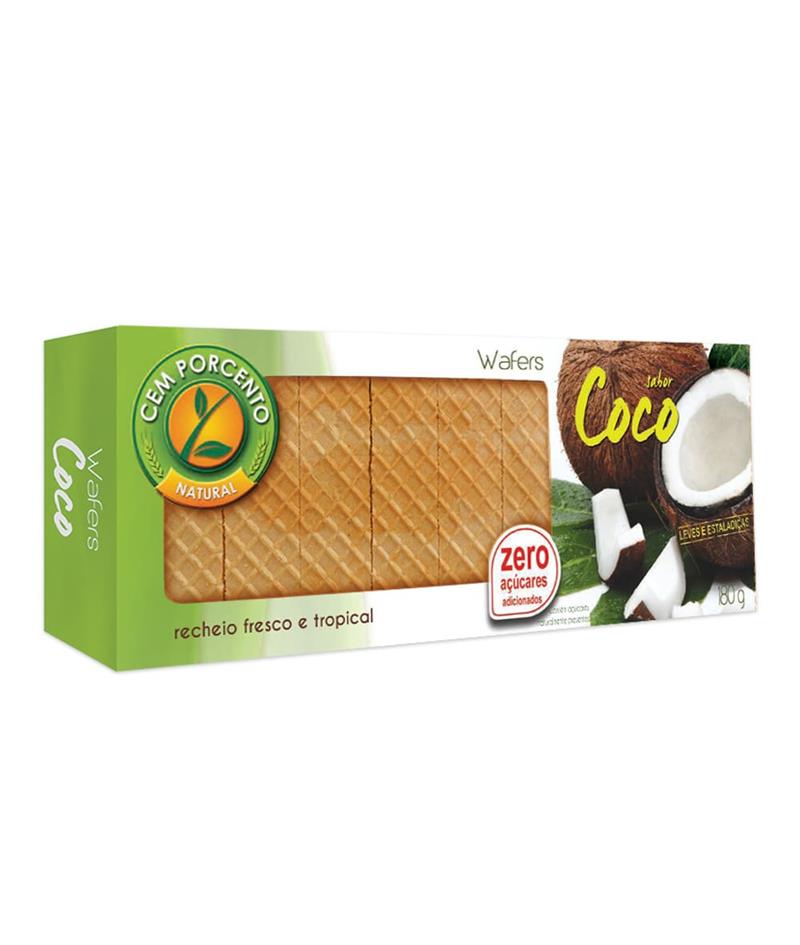 Pacote de wafers sabor coco com selo natural e sem açúcares adicionados